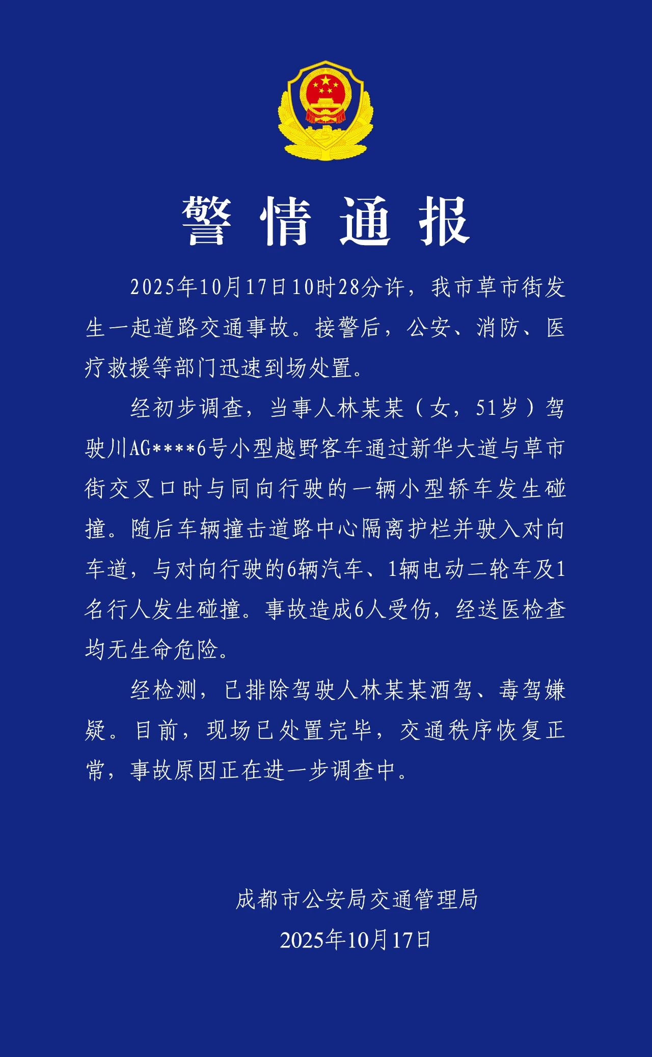 经初步调查,当事人林某某(女,51岁)驾驶川AG****6号小型越野客车通过新华大道与草市街交叉口时与同向行驶的一辆小型轿车发生碰撞。随后车辆撞击道路中心隔离护栏并驶入对向车道,与对向行驶的6辆汽车、1辆电动二轮车及1名行人发生碰撞。事故造成6人受伤,经送医检查均无生命危险。